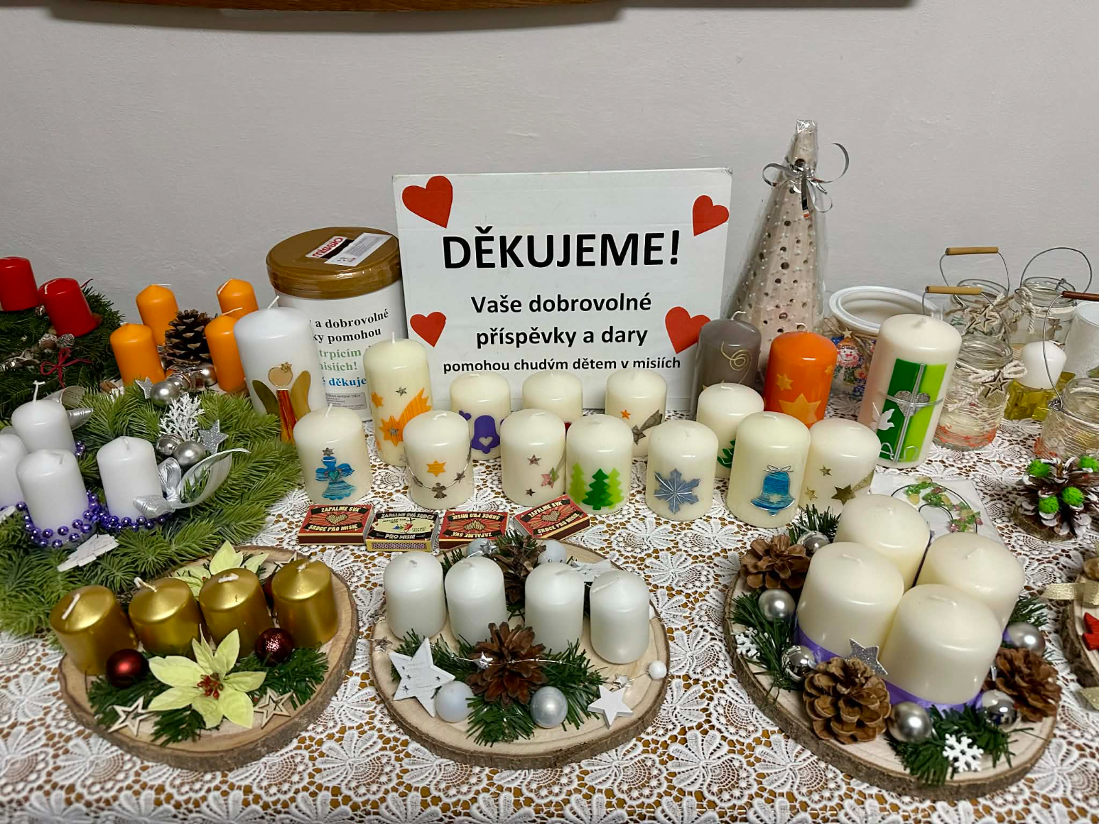 Misijní jarmark otevřen vždy při bohoslužbách a biblických hodinách a najdete zde adventní dekorace, svícny, betlémy, svíce zdobené voskovými pláty a dárky pro radost. Nechybí Misijní kalendář na rok 2026 a další misijní materiály papežských misií.