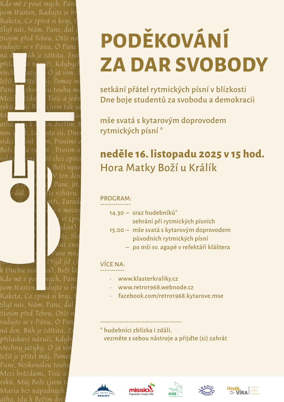 Zveme na Horu Matky Boží v Králíkách na mši svatou v neděli 16. listopadu 2025 v 15 hodin. Při této mši svaté s doprovodem kytar chceme poděkovat Pánu především za dar svobody v den státního svátku Dne boje studentů za svobodu a demokracii.